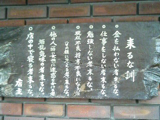 仕事に出ている皆はそれなりにヒーヒーなのかもしれないが、まぁ、頑張ってもらうとして。 平日公休日はおよそ整骨への通院から始まります。 もちろん何度も来ているワケですが、いまだに患者さんの混み具合の感覚が掴めません。 同じような時間帯に行っているにもかかわらず、いっぱい居たりスカスカだったりと。 そして次は郵便局。 ワシは基本的に公共料金は引き落としにしてはいないので、たまにこうやって足を運ぶのです。 そりゃあ引き落としは便利なのだろうけれども、なんでもかんでも便利にしちゃうとサボりまくりですから。 つーか、ちゃんと局員に客相手の仕事させてやるぜ!!(何様だ そして駅前の西友。 買いたいものがあるのですが、とりあえずは値段と品物を見るだけ。 よほど気に入ったものがあればともかく、時間がある時は他の店も見てみたいから。 電車に乗って二つ移動。 駅から降りて徒歩にて行進開始。 途中の某メガネ屋さんの店頭にある超音波洗浄器でメガネを洗う。 普段の通勤ルートだとこれが置いてあるような店って無縁だからなぁ( ̄д ̄; 徒歩移動中。 普段は歩かない道を往くとまた楽し。 こういうのんびり感は平日ならでは。マターリ。 途中に見かけた工場跡地。 なかなかの敷地面積で横断歩道とかあるし。 ケータイ写真じゃ納まりきらない大きさ。 なんか、こういう兵どもが夢の跡的な場所に佇むのは嫌いじゃないです。つーか、好き。 特に冬の季節、寂しげな場所でぼーっとするような後ろ向きな姿勢は心の中のなにかを満たしてくれます。 この工場の直接関係者ってワケでもないしな。うむ。 そしてダイエー某店に到着。 今回の購入物が西友と比べて明らかにお得であれば買っちゃうつもり。 ……まぁ、結果的に西友で買う事にしちゃったワケですが。 品揃え的に大差なかったっす(´・ω・`; そしてダイエーの近所の洋食屋(っぽい店)で発見した『来るな訓』。 これが本日最大の発見!! 読んでみれば当たり前の事ばかりなれども、ババンと掲げているあたり、 店主の漢っぷりが顕れているかのようw 無駄にカッコイイ!! そして地元まで歩いて帰ったワケですが、途中にこんな標識(?)が。 自転車と歩行者を明確に区分しようという意図らしいのですが、 守っている人(ってゆーか、自転車ね)はほぼいませんでした。 歩道を分けているワケですから、当然のように植え込みとかもあったりで、 どこまでも一直線に走れないような状態になっている部分は自転車はわざわざスピード落して曲がったりはしません。 まぁ、自転車という乗り物の特性を考えれば仕方なしか。 ちなむと本日の買い物は冬用のパジャマと室内用スリッパでした。 他人の目に触れるものではないので、わざわざ遠くの店に見に行く行為は無駄でしかないのですが、 この無駄さ加減もまた好きなのです(´・ω・`;