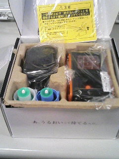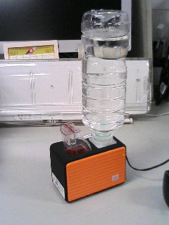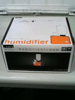 喉風邪もまだ完治していない事もあり、職場用に加湿器なぞ購入してみました。 CCP KX-60UP-OR ペットボトルタイプのやつですな。 箱。 中身。説明書、保証書、お手入れ用ブラシ、本体、ACアダプタ、 そしてペットボトルにつける専用キャップが二種類付属。 好みの色の方を使おうかな~って思ったらサイズが違ってましたw ペットボトルにも規格があるのか(@w@; 組み立ててみる。 小型なので置き場所にはさして困る事はなさそう。 で、ペットボトルの中身が無くなると、キャップのスプリングによってペットボトルが自動的に持ち上げられる仕組みなのですが、どっちにしろ本体の中の水が無くなれば止まる設計のハズ。意味があるのかないのか……。 早速稼働。 見えやすいように後ろにバッグを置いてみるw 小型ながらも、超音波式という事でかなりのパワー。おおう、これはスゴい!! ケータイでやり取りできる何人かには動画を送りつけてみたので、その凄さはご理解いただけるかとw そう、超音波式!! 言葉の意味はよくわからないが、とにかく凄い自信だ!! ペットボトルタイプの加湿器としては、各種メーカー品の中でも群を抜く価格なワケですが、値段だけの事はありそうです。(他社のは実売3000円弱、この商品は6000円弱) とりあえず、この日は職場内で注目されまくりでした。 見る人は必ずといっていいほどに指先をかざして濡らされていきましたw
