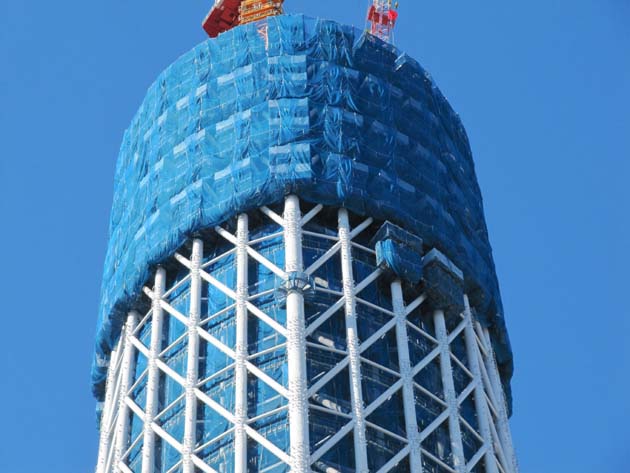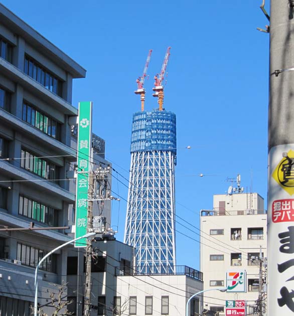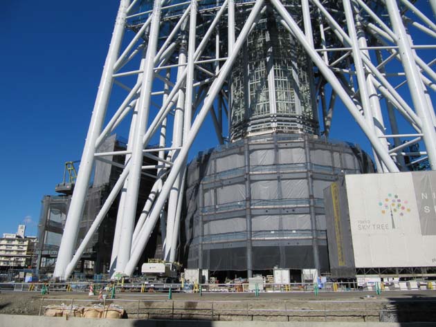 とりあえず会おう。的に集合しただけなので、何をするという目的がありませんでした。 よし、それじゃあ…… 建設中の東京スカイツリーを見に行こう!! この写真は錦糸町駅から少し歩いた場所。最寄駅は押上……だったかな。 滅多に利用しない線だけに、よくわかりません。 こんなに近くに見えているのだから、歩いて十分じゃね? ってカンジで徒歩移動です。 ひと駅分も歩いたあたりで、全貌が見える場所に着きました。 つか、あまり近付きすぎると写真に収められないんだよなぁ……。 ツリーの足元まで移動。 でかい……! 正月なので当然のように作業はしていませんでしたが、誰か作業員の一人も貼りついていれば対比的に大きさがわかるのになぁ……(´・ω・`; 見上げてみる。 やはりでかい……! 全体的な曲線もそうなのですが、肉眼で感じる存在感は写真では表現できないのがなんとももどかしい。 お台場ガンダムでも感じた事ですが、機会があれば直接見てほしいものです。 ツリーの横の川を挟んだ道路。 見物人がいっぱい居ます。考える事は皆同じなカンジw 人の集まるところに商売あり。 誰か何かやらないのかなぁ? こんな痛チャリで見物に来ている人もいました。 注意がツリーに向けられていたので、遠慮なく激撮! 無許可!! (ぉぃ ツリーの横のビルが解体中でした。 中にホワイトベースが隠れてないかと思いましたが、特になにもなし。残念 (´・ω・`; しかし、ビルと対比すると、やはりツリーの巨大さが際立ちます。すげぇな、おい。 進捗状況(?)もパネルで表示中。 近場に住んでいる人で、工事の状況を毎日写真に収めてブログで公開している人とか居るんだろうなぁ。 面倒なので探しませんが。 ところで。 ツリーに向かう途中で見掛けたラーメン屋にて。 ……。 普通に笑ってスルーすればいいところですが、マジレスしてしまうと、 『何をもってしてイケているんだろう?』 きっと深く考えたら負けなんだ (;´Д`) 新年が始まりました。