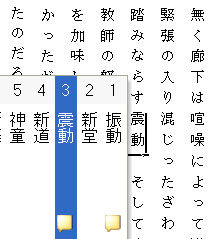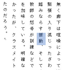 もう少し早いペースで進むかと思ったものの、たまに発生する 「ぅゎ。この部分まるまる書き直さないと」 に見事に引っ掛かり、こんな有様に。 まぁ、それはそれ。 ワードを使っていて、「へぇ、こんな機能があるんだ」 のひとつをご紹介。 すでに打ち終わっている文章。 その中の一部を選択。 すると、再変換ができるのれす!! ……普通にワードを使っている人なら知ってる機能ですね、すんません。 普通じゃない使い方をしていたもので、こういう小手先の技を発見すると、チョー新鮮です。 さて。銀行に行く用事がありまして。 散歩がてら外に出てみました。 信号待ちの足元にこんなものが。反射板……? 周囲を見ても事故らしい傷痕は見えないし、何があったんだろうかと。 毎日のように通る場所なので、こういうちょっとした事が気になります。 こんなのも発見。ヘッドホンですね。先端に付いている端子からすると、ケータイに繋いでいたものが何かの拍子に落ちてしまったのでしょうか。 どうでもいいですけど、撮りたい対象物が小さすぎてその向こうの壁にフォーカスが合ってしまいます(汗 出掛けたついでにこんなのも買ってみました。スイーツ(笑)! 個人的には黒の方が好み。 量はそこそこですが、ワシはグルメではないので、ガッツリとプリンを食べたいときはジャンボプッチンプリンを買うと思います。 普通にプリン好きな人なら試してみて損はないかと思います。 どうでもいい話ですが、この間、ズームインで 『wktk』 の女子高生における認知度調査(?)をやってました。ズームインは視聴率も高そうなので、見た方も多いのではないかと思います。 普通にネットでいろいろ見る人なら認知度も高い単語ですが、電波で流されちゃうと、いかにも女子高生が流行らせていますよ~的な空気が漂うのはなんとかならんものかと。 まぁ、どうでもいい話ですよ。 電車に揺られる者の殆どは帰路の途なのだろう。男自身がそうであるように。 |