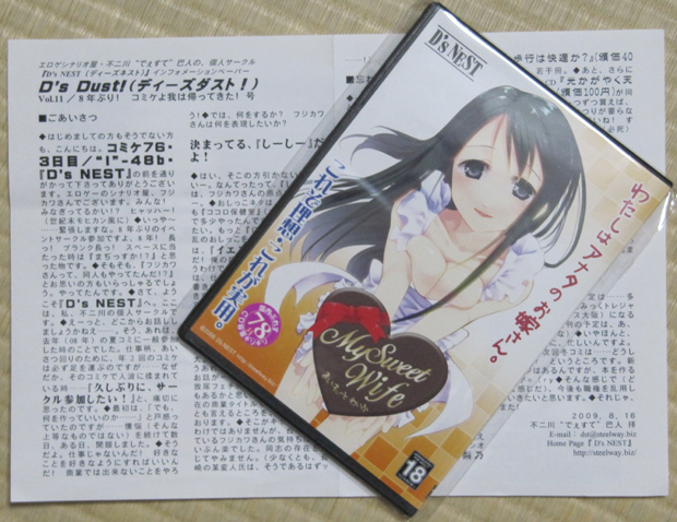久しぶりの参加。しかも一般。行列に並ぶのイヤだなぁ、とか思いながらも、たまにはよかろう、と。 しかし、駐車場で待っているのは暑かった……。暑いとゆーか、熱い。 駐車場で待つべく誘導先で足を止めた時は、あらかじめトイレに行かなかった事を後悔し始めたもんですが、なんか、ほとんど汗と化したのか、家に着くまでトイレは行かずとも大丈夫でしたw 今回の戦利品。 オモテ表紙はエロいので、ウラ表紙で失礼!w 姫巫女神社・分隊長氏 (http://f1.aaa.livedoor.jp/~himemiko/) の新刊。もちろん18禁。 寄稿させて頂いたので、原稿料代わりにタダでせしめた一冊。うひ! 昔、チャレンジしたグレースケール原稿ではモアレとか出てイヤーンなカンジでしたが、今回の分はイイカンジに印刷されていたので、印刷技術の進歩(?)を感じました。 マンガは描けませんが、イラストならたまに描くとやる気ムンムンです! 機会があれば、またイラスト描きたいですのぅ。もちろん、エロ大歓迎!!(バカ 『まい・すぃーと・わいふ』 (D's NEST) (http://steelway.biz/index.html) 声優の奥川久美子さん (http://okuck.seesaa.net/) が白エプロン姿で売り子をされていて、俺もう大興奮!!(大バカ 『声優さん』と対面するのは初めての事で、緊張のあまりに『応援してます。頑張ってください!』としか言えなかった機転の利かなさぶりはいずれ懐かしい記憶になるだろうか……。 声優といえば、表名義と裏名義を使う声優さんは裏名義での活動時は顔出しNGというのは基本的な事ですが、いつからかエロゲ(関連)仕事をメインにする方も増えてきているようで、姿を出す事を問題としない方が増えてきているっていうのは……まぁ、時代ってやつですか? (ツッコんだ事情はよく分からないのでスルーでお願いします) 実を言えば、この二点をゲットした時点で今回の目的は終了。 あとは、気になるジャンルを流して……と思ったら、想像以上に移動が厳しく、とっとと撤退する事に。 しかしそれではあまりに芸が無いので、企業ブースへ足を伸ばしてみることに。 買おうかどうしようか迷っているものがあって、まぁ、せっかくだし買っていくか…… そう思ったものの、目当てのブースに到着したワシの目の前には 『 完 売 』 の二文字がががっ!! 11時回ったかどうかの時間で完売ってナンだYO!! ふ、ふんだっ! 恥ずかしい紙バッグ持ち歩かずに済んだと思えば!!(ツンデレ そうそう。 秋葉原の ベルサール秋葉原 (http://www.bellesalle.co.jp/bs_akihabara/) で、 『えどっ娘 天下大変!』 (http://www.charadio.net/) のイベント(公録ではなく、イベント) があったので、ちょっと行ってみる事に。 入場無料となっていたので、30分前到着で様子を見てみようと。 ベルサール秋葉原のイベントスペースがどういうものか知らなかったのだが、パイプ椅子を並べられるだけ並べて、あとは立ち見。場合によってはご遠慮願う……みたいなものかと思っていたら。 イベントスペースというか、内装を施した広いガレージってカンジだった。 椅子もなく、床に座る人々。……うむ、想像していたよりも酷いw 開始時間になり、声が流れる……。『ゆめ姫とみはるは少々遅れているようです……』 みたいな。 そういう体で始まるイベントか。 そう思ったら、本当に遅れていたらしく、30分後にやっと開始。なんぞこれw まぁ、神田朱未嬢と三上枝織嬢を目にしたのでちょっと満足。 うむ、たった一日で複数の声優さんを見てしまったわ! さらに言えば、ゲストの小寺可南子さんのミニライブもあり、ワシの隣と、その前の人が大ハッスル!! イベント的にはありがたいファンの方達なのでしょうが、興味本位でちょっと見に行った程度のワシからすれば耳を痛くさせるだけの人で……。ぬぅ、もっと後ろで立ち見客になっておけばよかった。 ミニライブ、トークの他に、イース7のプレイ画面紹介とかもあったので、そこは満足。良く出来たゲームのように見受けられたが、PSPでのアクションゲームというのが引っ掛かる……。ついついエキサイトしてしまうと画面の固定が難しくてプレイどころじゃないんだよなぁ。エキサイトしてなくてもダメなものはダメなんだが。 余談。 やはりDQ9持ち込み率はハンパなかったようで、あまり頻繁なチェックはできなかったものの、今日だけで60人近くの方とすれ違いました。現在120人! もひとつ余談。 夕刻、夕飯代わりにと入った某マクド2階客席はDS開いた人で埋められており、座る余地ナシ! 『席が空きそうにないから持ち帰りにして』 と1階レジに持ち込んだところ、トレイの上のものだけしか袋に入れてくれなかった。紙ナプキンなし!! サービス悪ぃ!! |