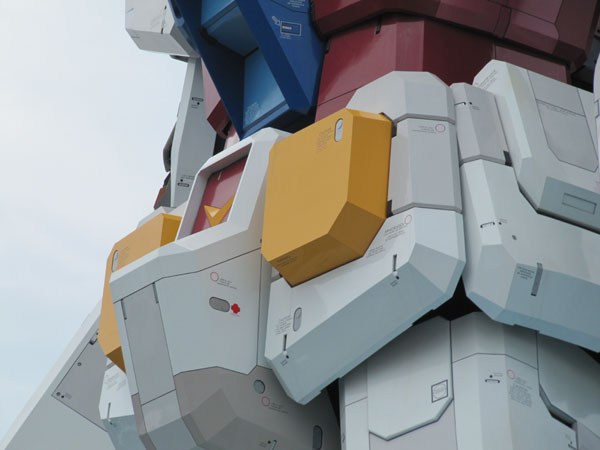 ウホ! かっちょエエ!!w 俺もう大興奮!!w 公園の入口より案内板&係の人の持つ案内プラカード(暑い中、お疲れ様です)に従って進むと、木々の上にそびえるように見える肩と頭部が現れました。背後からの接近です。 ちなみに、全身像はこの日記には載せません。 だって、全身像なんて他のサイトや日記でさんざん載せられるだろうから!w 等身大というものは、写真ではその迫力は伝えきれません。 ガンダムファンである事も一因となっているのでしょうが、その雄姿を前に、『すげぇー!』 『カッチョええーーっ!』 以外の言葉が出てきません。ついに日本はモビルスーツ開発の時代に入ったのです……!w ところで、背が見えた時点で多くの来訪者がカメラを構えます。 これは当然の行為のように感じられますが、 『背中なんか撮って楽しいのー?』 と、亭主(と思われる男性)に問いかけている婦人がおりました。 楽しいに決まってるだろうが!! 撮れるものは全方位から撮るんじゃ!! 亭主どの、ゲンナリした顔をせずに嫁にきちんと言い聞かせてやってください!! うむ。カッコイイ (^w^ 電動ではないのかもしれませんが、可動ではあると思われるパーツは流石です。 むしろ、ここまで作り込んでおきながら関節は動きませんとかありえない! 腹部のアップ。 このように各所に様々な注意書きと手動コックのギミック。 果たして、このコックは飾りなのか本当に動くものなのか……! 各ダクト部からミスト噴出のデモもあり、その際に上を向くガンダム! うおお! 顎ががら空きだぜ!! とばかりに拳を突き入れたい衝動に駆られます!!w 今日の天気は、曇り時々晴れ……といったところだったでしょうか。 白い背景のためにケータイで撮影した人は残念な写真ばかりになったかもしれません。 雲ひとつない天気であったならば、青空をバックにしたガンダムはさぞや壮観であった事でしょう。 まぁ、梅雨明けのしていない日曜でしたから、雨に振られないだけマシだったと思いたいです。 このイベントは8月いっぱいとの事らしいので、来週末からは小中高生がひっきりなしにやってくる事でしょう。 お盆時には近くでコミケもあるので、さらに凄い事に……。 でも、天気の良い日にもう一度くらい訪れても良いかな、って気にはさせられました。 東京近隣にお住いの方、または夏休みで東京に出て来られる方は、是非とも足を運んでみてはいかがでしょう?