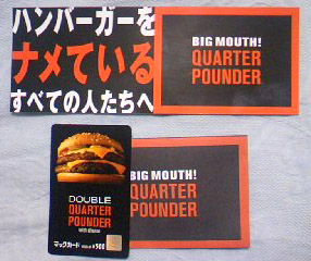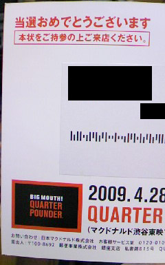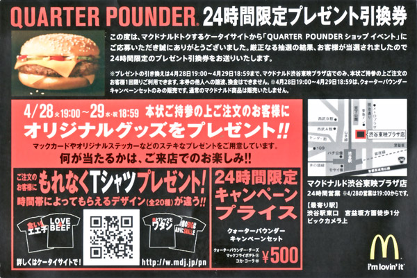 無料開放日という事もあってか、家族連れとか、もう人がいっぱいでした。写真は無いけどね! そしてそんな環境の中でPSz(http://phantasystar.sega.jp/pszero/)に興じるPSU仲間の面々。 後に聞いた話では、周囲の我々を見る目はちょっと奇異なものを見るソレであったとか……。 そう、昨日はPSU仲間のオフ会があったのです。 まぁ、秘密のオフ会(?)なので内容については敢えて触れずに。参加された皆さんの胸の内にしまっておくという事でw どちらかといえば昨日という日に関する日記ネタはこちら。 先日、このようなハガキが届きました。 一昨日から昨日の24時間限定のイベントのお知らせ。 宛名面には『当選おめでとうございます』の文字が。 そういや、もともとイベントのお知らせがあったのはケータイに来たメルマガで、その時になにか応募したっけ。気楽にポチポチ操作してたんですっかり忘れてましたw ちなみに、現地に到着した時、『最後尾はここかな~?』って探した場所は見当違いで、もっともっと遠くに最後尾があって驚きました。 まぁ、イベント限定のクォーターパウンダーキャンペーンセット(クォーターパウンダー・チーズ、ポテトS、コーラM)プラス、Tシャツで500円ともなれば行列ができない筈もなく。 オフ会の前の昼食のつもりで行ったので、時間に間に合うか心配になりましたが、限定セットのみの販売という事で、列はサクサク進みました。 大量にドカドカ作っているらしく、タマネギもシャキシャキでジャンクフードとしては新鮮な食感も味わえてちょっと満足w で、貰ったTシャツがこちら。たぶん、『食い意地を肯定せよ』 袋から出していないのでなんともw フリーサイズらしいのでちゃんと着られるとは思うのですが、どこで着ようかなぁ……(´・ω・`; で、ハガキを持参した事で貰ったものがこちら。 上がステッカー。下がマックカード(500円)。 ……って。ワシはタダで食った上にTシャツというお土産を貰ったって事かぁ!!( ̄д ̄; それで、その後のオフ会ではやたらとハッチャけてしまったワケだな、うん。(違)