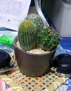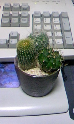 母がサボテンを買ってきてくれた。 愛着のあったサボテンを失った事がショックだったので、 新しいものがあれば良いというものでもないのだが……。 わざわざ買ってきてくれた以上、頑張って育ててみようかと。 しかし、一つの鉢にひしめく三種のサボテン。 明らかに鑑賞用なのだが、それでも植物である以上は成長はするだろう。 この状態のまま大きくなったら、それは大変な事になるんじゃなかろうか……? まぁ、そんなすぐに太るってワケでもないだろうから、暫くは様子見だろうか。 サボテンはいろいろと話しかけると良いなどという事も聞くが、 植物相手に饒舌に語れるようなワシでもないので、 風呂に入っている間なんかはネットラジオでも聞かせてみようかと。 植え替えが必要になるくらいに大きくなってくれるといいなぁ。